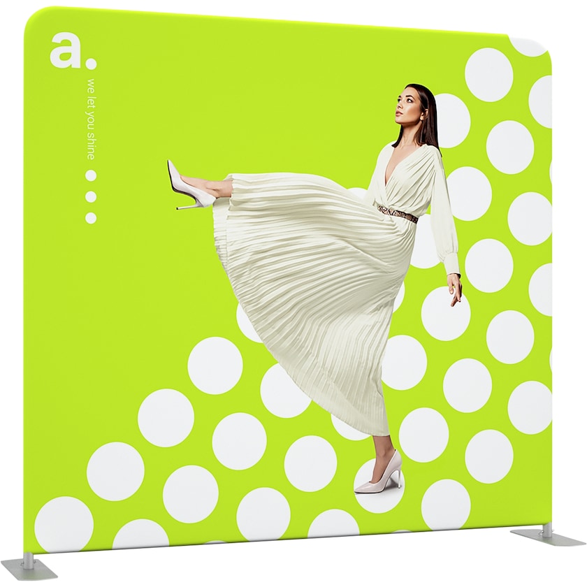 240 cm breite Ausstellungswand, die sehr einfach zu montieren ist. Die Ausstellungswand besteht aus Aluminiumrohren, die ohne Werkzeug zu einem Bogen zusammengesetzt werden. Der Stoff mit Ihrem Druck wird dann über den Bogen drapiert und mit einem Reißverschluss verschlossen. Das Ergebnis ist eine Ausstellungswand ohne Knicke und Falten. Der Druck erfolgt mit umweltfreundlicher Farbe auf Wasserbasis auf beiden Seiten. Die Ausstellungswand ist einfach zu montieren und leicht und eignet sich perfekt für spontane Veranstaltungen und Kampagnen. Der Stoff ist bei 30 Grad in der Maschine waschbar. Um die Motive austauschen zu können, können separate Stoffe erworben werden.