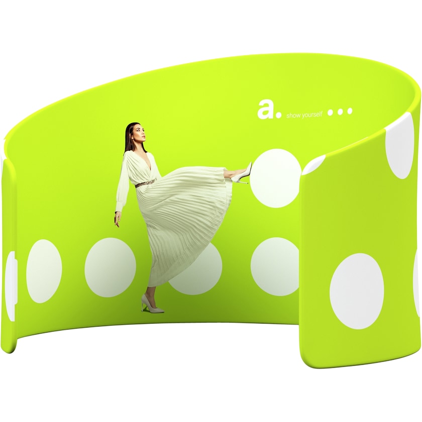 Runde Ausstellungswand, die ein Gefühl von Raum schafft. Die Struktur der Ausstellungswand besteht aus Aluminiumrohren, die zu einem Bogen zusammengesetzt sind. Die Teile werden ohne Werkzeug zusammengebaut. Man fädelt den von uns bedruckten Stoff über den Bogen und schließt ihn mit einem Reißverschluss. Der Druck erfolgt mit Farben auf Wasserbasis auf der Vorder- und Rückseite. Bei Bedarf kann der Stoff in der Waschmaschine bei 30 Grad gewaschen werden. Sie möchten weitere Motive? Dann bestellen Sie einfach einen weiteren Stoff bei uns.