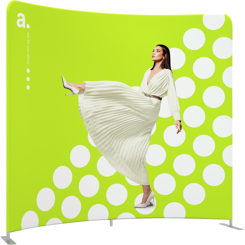 240 cm breite Ausstellungswand, die leicht gebogen ist. Die gebogene Form verleiht der Wand einen gewissen 3D-Effekt. Die Wand hat eine moderne Konstruktion aus Aluminiumrohren, die zu einem Bogen zusammengesetzt sind. Die Montage erfordert kein Werkzeug und ist schnell erledigt. Der Stoff mit Ihrem Druck wird dann über den Bogen gezogen und mit einem Reißverschluss geschlossen. Dieses clevere Design sorgt für eine faltenfreie Ausstellungswand ohne Falten. Der Stoff ist sowohl auf der Vorder- als auch auf der Rückseite mit umweltfreundlichen Farben auf Wasserbasis bedruckt. Wenn Sie den Stoff waschen müssen, können Sie ihn bei 30 Grad in der Waschmaschine waschen. Wenn Sie das Motiv wechseln möchten, bedrucken Sie einfach einen bedruckten Stoff bei uns.