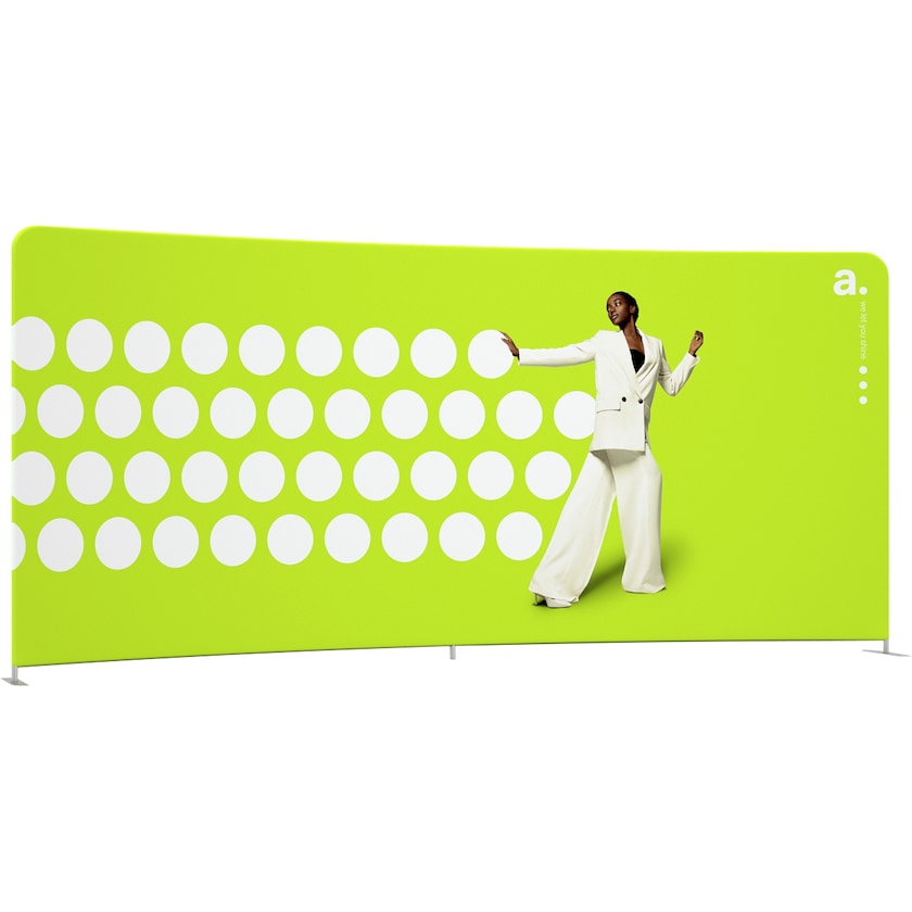 Leicht gebogene Ausstellungswand von 500 cm. Die schön geschwungene Form verleiht der Ausstellungswand einen interessanten 3D-Effekt. Die Ausstellungswand hat eine einfach zu montierende Konstruktion aus Aluminiumrohren, die zu einem Bogen zusammengesetzt werden. Für die Montage ist kein Werkzeug erforderlich. Der Stoff, den wir mit Ihrem Druck liefern, wird dann über den Bogen gezogen und mit einem Reißverschluss geschlossen. Der Stoff wird umweltfreundlich mit Farbe auf Wasserbasis auf beiden Seiten bedruckt. Sollte jemand versehentlich etwas auf den Stoff verschütten, kann er bei 30 Grad in der Waschmaschine gewaschen werden. Wenn Sie das Motiv der Ausstellungswand in Zukunft ändern möchten, bedrucken Sie einfach einen neuen Stoff bei uns.