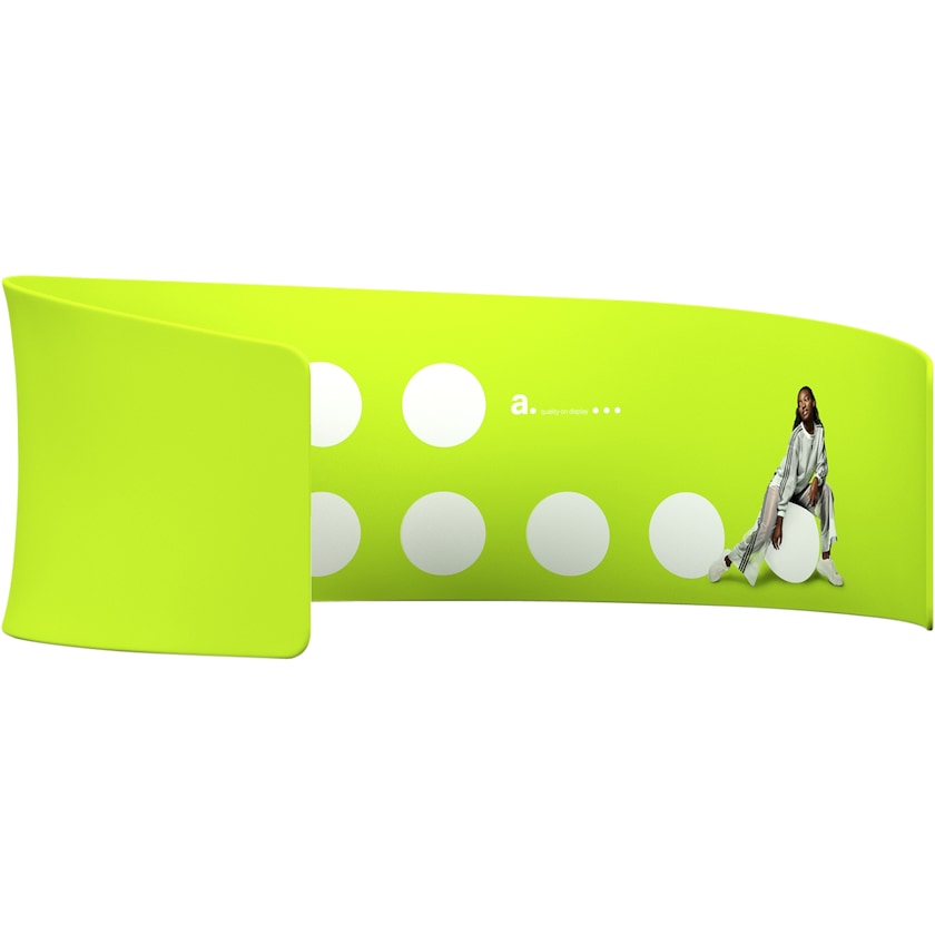 Große abgerundete Wand mit einer vollen Breite von 650 cm. Die runde Form schafft eine angenehme raumähnliche Oberfläche. Dank einer ausgeklügelten Konstruktion aus Aluminiumrohren, die sich zusammenklicken lassen, kann die Ausstellungswand ohne Werkzeug aufgebaut werden. Nachdem Sie die Aluminiumrohre zu einem Bogen zusammengesetzt haben, ziehen Sie einfach den Stoff über den Bogen und schließen ihn mit einem Reißverschluss. Der Stoff ist auf der Vorder- und Rückseite mit umweltfreundlicher Farbe auf Wasserbasis bedruckt. Der Stoff ist bei 30 Grad in der Maschine waschbar. Wenn Sie das Design einmal ändern möchten, bestellen Sie einfach einen neuen Stoff.