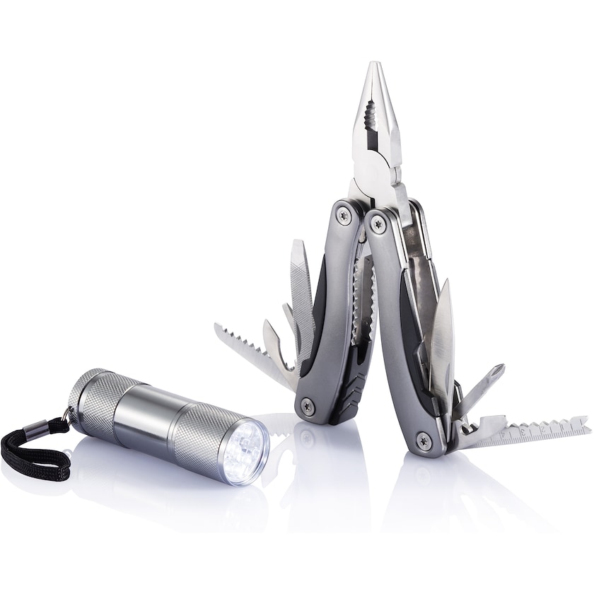 Praktisches Set mit Multiwerkzeug Baumgarten und LED-Taschenlampe. Multiwerkzeug hat 14 Funktionen und die Taschenlampe 9 weiße LED-Lichter. Alles wird im schwarzen Geschenkkarton geliefert. Der Preis für die Markierung (Druck / Lasergravur) bezieht sich auf ein Produkt.