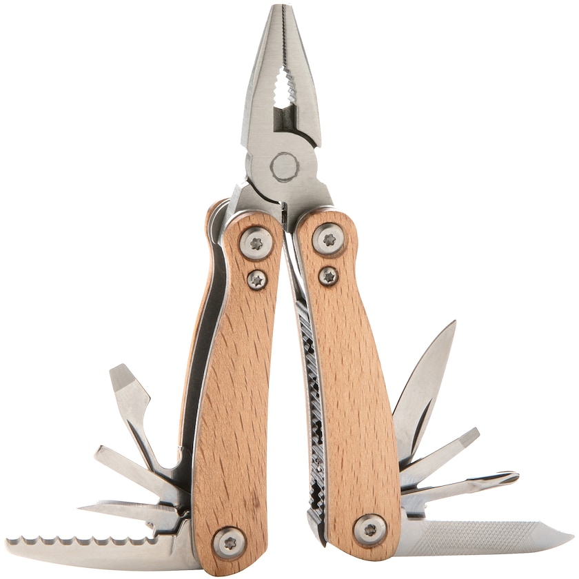 Kompaktes Multiwerkzeug aus Edelstahl mit Buchengriff. Garrix hat 12 Funktionen und wird in einer eleganten Geschenkbox geliefert.