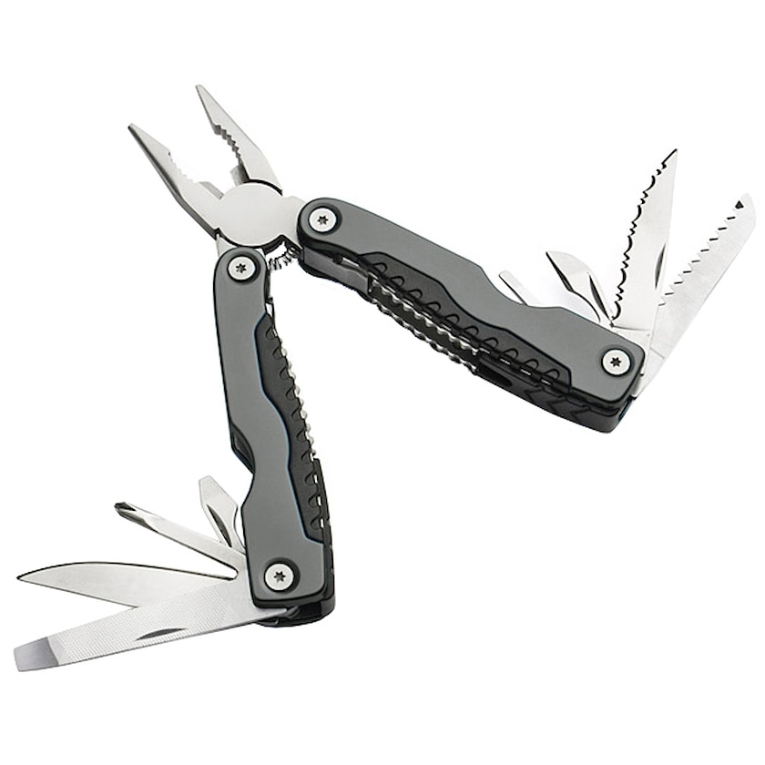 Robustes Multiwerkzeug mit Metallgriff. Enthält Zange, Säge, Flaschenöffner, Korkenzieher, Holz- und Metallfeile, Schlitz- und Kreuzschlitzschraubendreher und zwei Messer. Die Lasergravur erfolgt auf dem Griff.