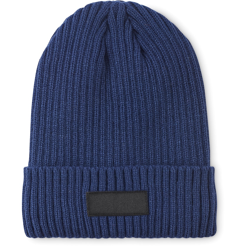 Bedruckbare Strickmütze mit schwarzem Etikett. Die Mütze besteht aus Acryl und hat ein hochwertiges 3M-Futter. Unisex-Modell, das für alle Kopfgrößen geeignet ist.