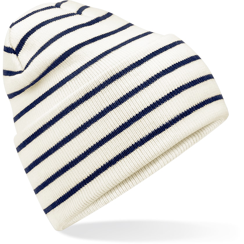 Gestreifter Hut mit Stickerei. Der Stoff besteht zu 50% aus Acryl und zu 50% aus recyceltem, GRS-zertifiziertem Polyester. Eine stilvolle Mütze, die sich von der Masse abhebt.