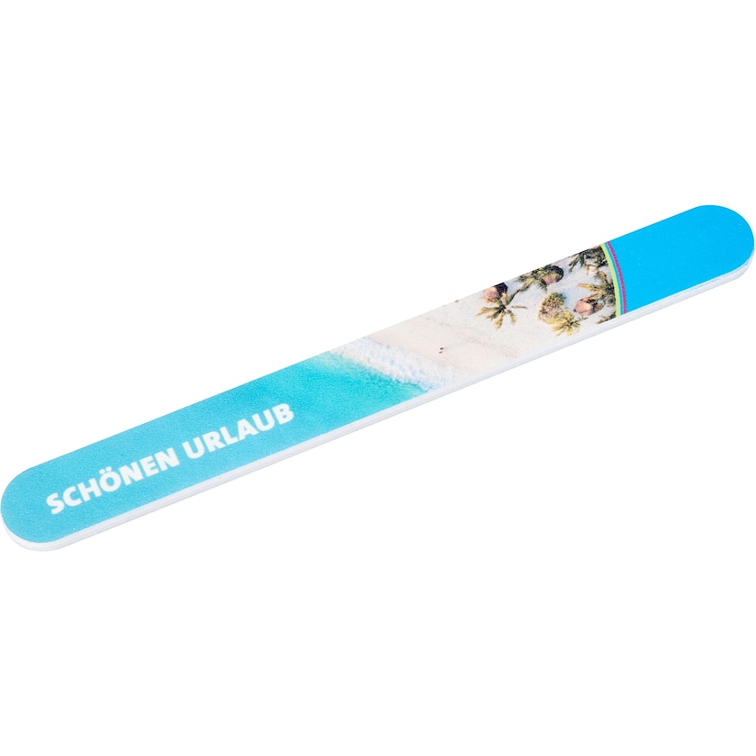 Hochwertige Nagelfeile in professioneller Studioqualität. Die Nagelfeile ist weiß und der Druck erfolgt ganzflächig auf der einen Seite. Der Kern ist aus Kunststoffund das Äußere aus Sand. Ein Etui aus Kunststoff kann ebenfalls erworben werden.