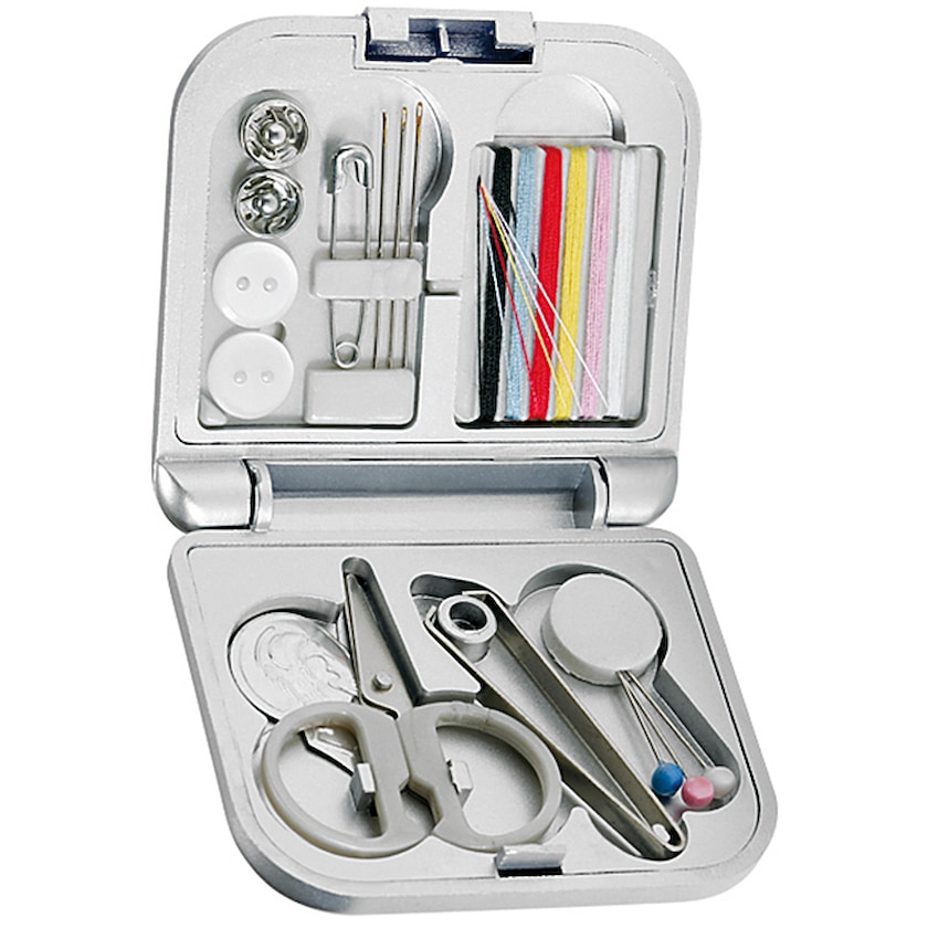 Preiswertes Nähetui in silberfarbener Plastikbox.
