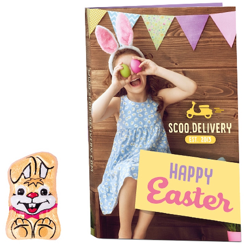 Karte mit Schokoladenosterhase im Inneren. Die Karte wird im 4-Farbdruck nach Ihren Wünschen bedruckt. Hier finden Sie viel Platz für eine wirkungsvolle Werbebotschaft!