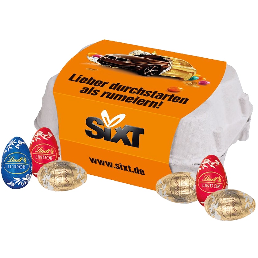6 Schokoladeneier von Lindt im klassischen Eierkarton. Die Schokoladeneier kommen in gemischten Geschmacksrichtungen und liegen auf einem schönen Kunstrasen. Der Druck erfolgt auf einem Banner, das um den Eierkarton gewickelt wird.
