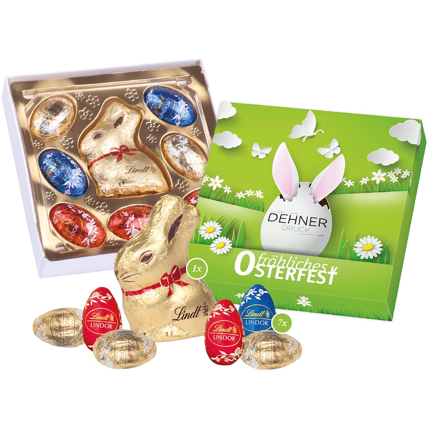 Pralinenschachtel gefüllt mit Osterschokolade von Lindt. Überraschen Sie Ihre Kunden! Die Pralinenschachtel besteht aus klimaneutralem und FSC-zertifiziertem Papier und enthält 42 Gramm köstlichste Schokolade.