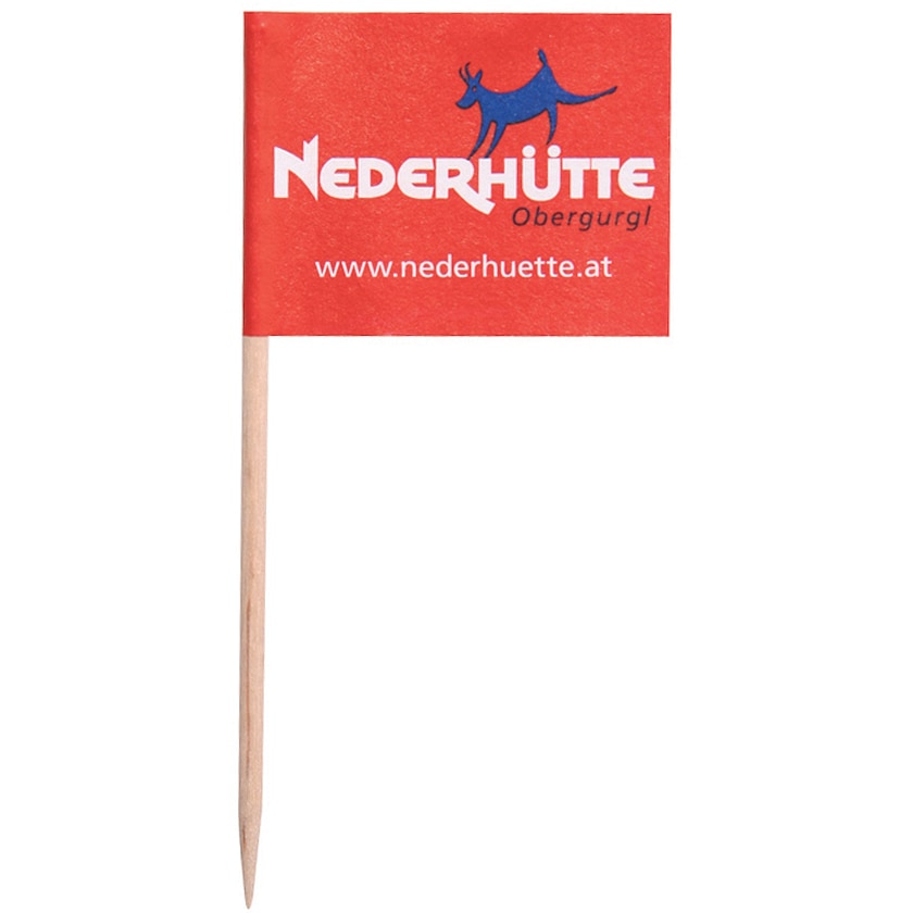 Cocktailflahnen mit Logo. Die Cocktailfahnen sind aus holzfreiem Offsetpapier gefertigt und an einem 80 mm langen Zahnstocher befestigt. Die Fahnen werden auf beiden Seiten bedruckt und können unterschiedliche Motive haben. Die Cocktailfahnen können in Einheiten zu 1000 Stück bestellt werden.