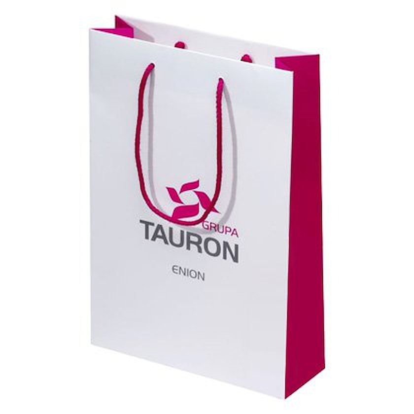 Moderne mittelgroße Papiertasche mit Trageschnur und Glanzfinish. Der Schnurgriff und die glänzende Laminierung verleiht der Tasche ein luxuriöses Aussehen. Die Papiertasche hat eine kartonverstärkte Oberkante sowie eine zusätzliche Kartonplatte im Boden für eine bessere Stabilität. Sie bestimmen das Design aller Seiten, der Schürgriff ist in vielen Farben erhältlich. Druck in max. 3 Farben gemäß Pantone-Skala, darüber hinaus in CMYK. Die Papiertüten sind alle innerhalb der EU gefertigt.