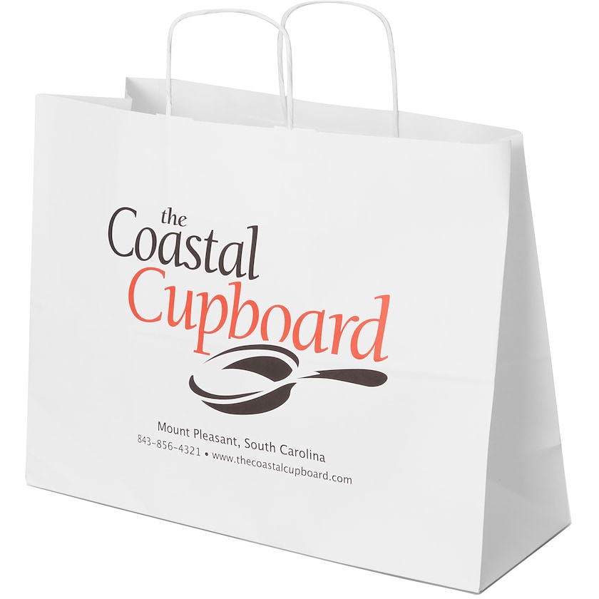 Große Papiertüte mit Druck über die gesamte Oberfläche. Die Papiertüte besteht aus einem glatten 100 Gramm schweren Papier. Die Griffe sind gedreht. Druckvorlage herunterladen und selbst gestalten. Die Mindestbestellmenge beträgt 3000 Stück. Es kann zu einer Über- oder Unterproduktion von bis zu 15 % kommen. Die gelieferte Menge wird in Rechnung gestellt.