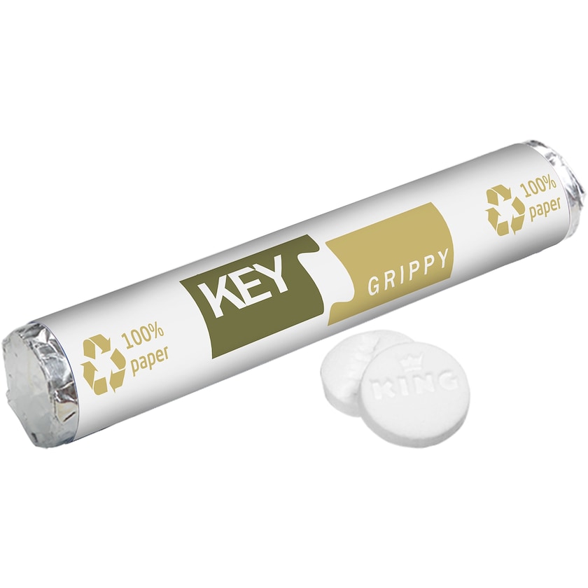 Rolle mit erfrischenden Bonbons mit Pfefferminzgeschmack. Die Verpackung der Rolle wird aus recyceltem Papier hergestellt. Ein schönes Give-Away für die Messe oder das Event.