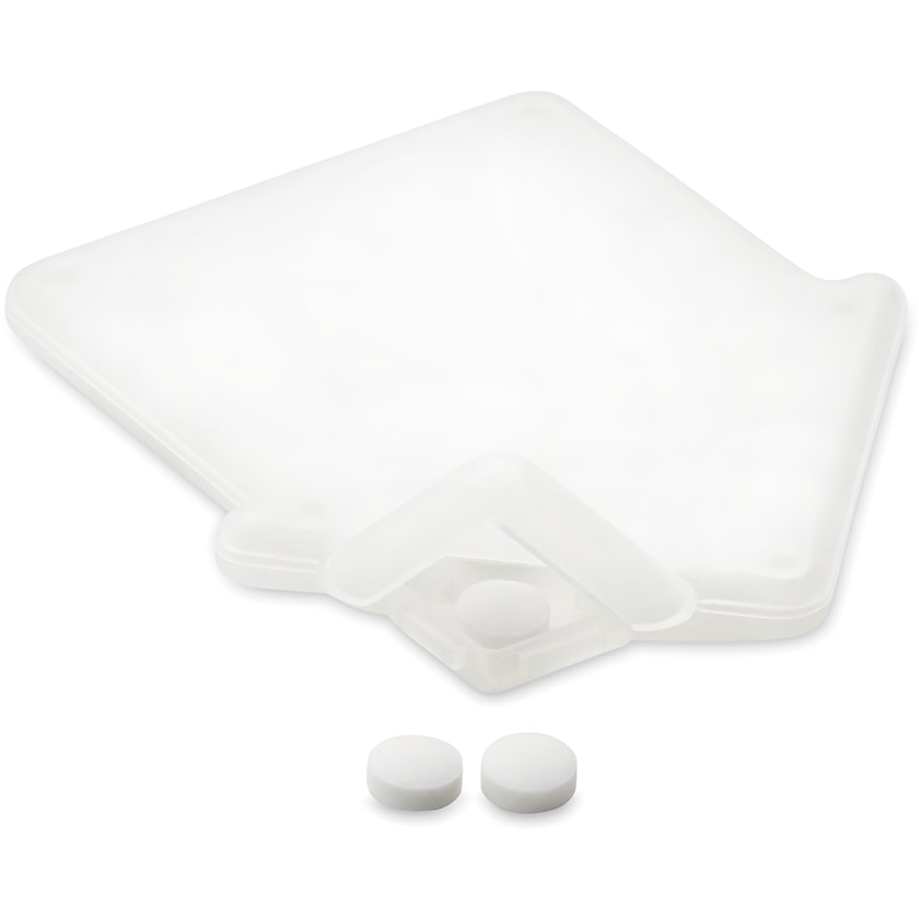 Frischekarte in Hausform mit zuckerfreien Minztabletten. Wählen Sie zwischen weißem oder transparentem Kunststoff.