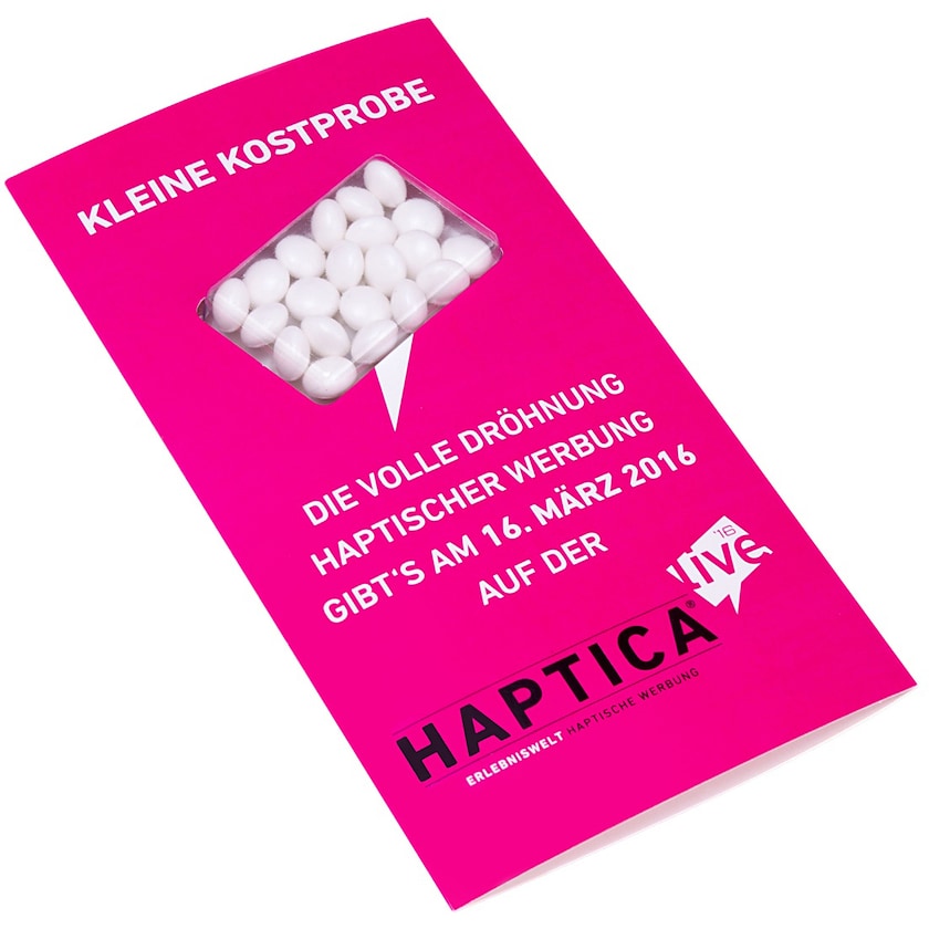 Blisterkarte mit 4g Dragees. Die Blisterkarte gibt es mit Fenstern in verschiedenen Formen und sie wird im 4-Farb-Fotodruck bedruckt. Sie designen selber Vor- und Rückseite Die Dragees gibt es in verschiedenen Geschmacksrichtungen und Sie können diese frei mischen. Coole Werbesüßigkeit mit großem Werbewert!
