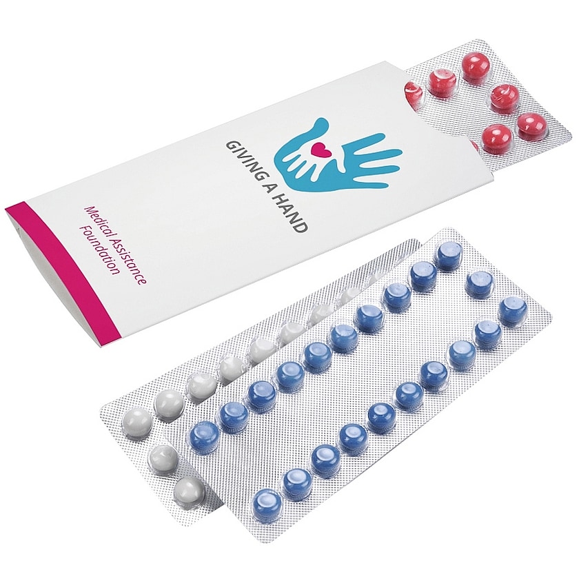 21 Pastillen in Pillenverpackung mit Papierhülle mit ihrem Logo. Die gesamte Papierhülle kann mit 4-Farb-Fotodruck bedruckt werden.