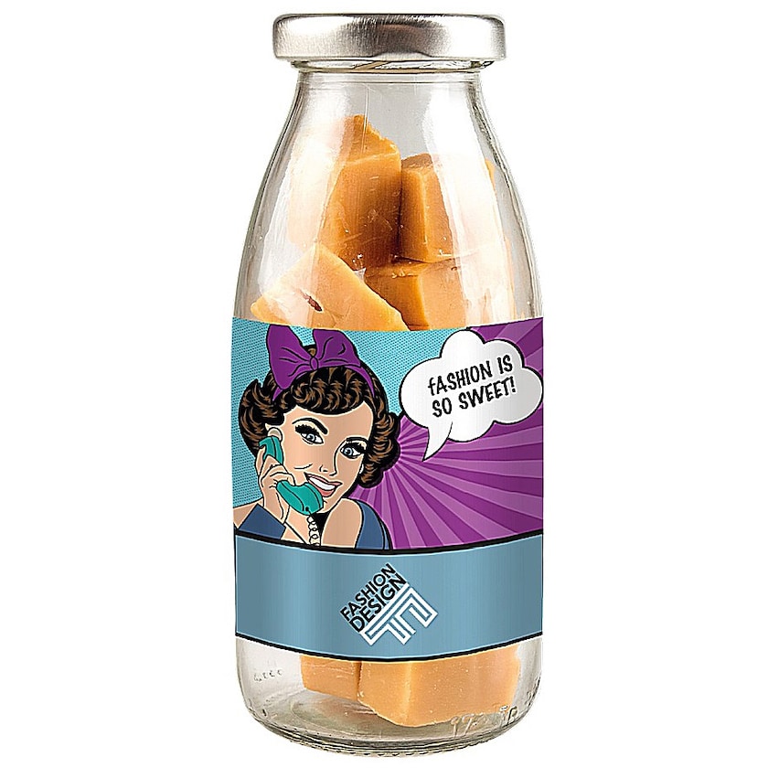 Glasflasche mit 140 g leckerem Toffee. Das Etikett wird im 4-Farb-Fotodruck bedruckt und Sie designen es selber nach ihren Wünschen. Eine coole und etwas andere Alternative zu Schokoladenschachtel!