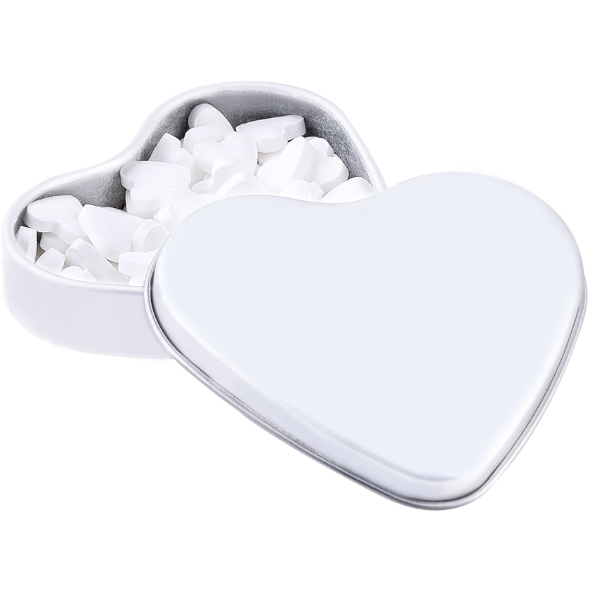 Metallbox in Herzform, gefüllt mit herzförmigen Mintpastillen.