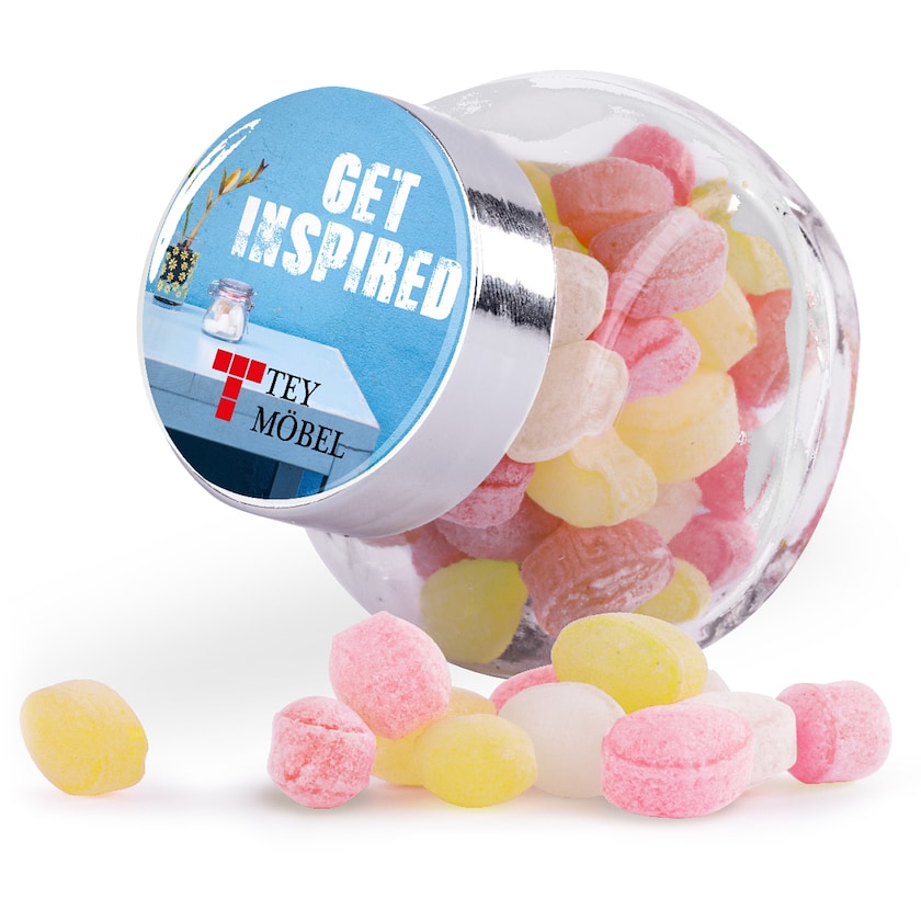Kleines Bonbonglas mit tollem Wow-Effekt! Der Deckel des Bonbonglases ist mit einem 4-farbig bedruckten Dome-Label mit Ihrem Aufdruck versehen. Die Bonbons haben unterschiedliche Aromen und werden in Deutschland hergestellt.
