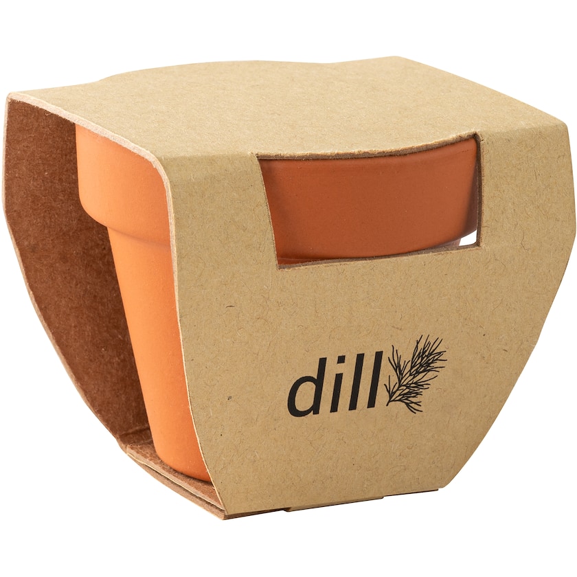 Tontopf mit Dillsamen und Erde. Pflegen Sie leckeren Dill im Büro oder Daheim. Nur 1-farbiger Druck möglich. Wird unmontiert geliefert.