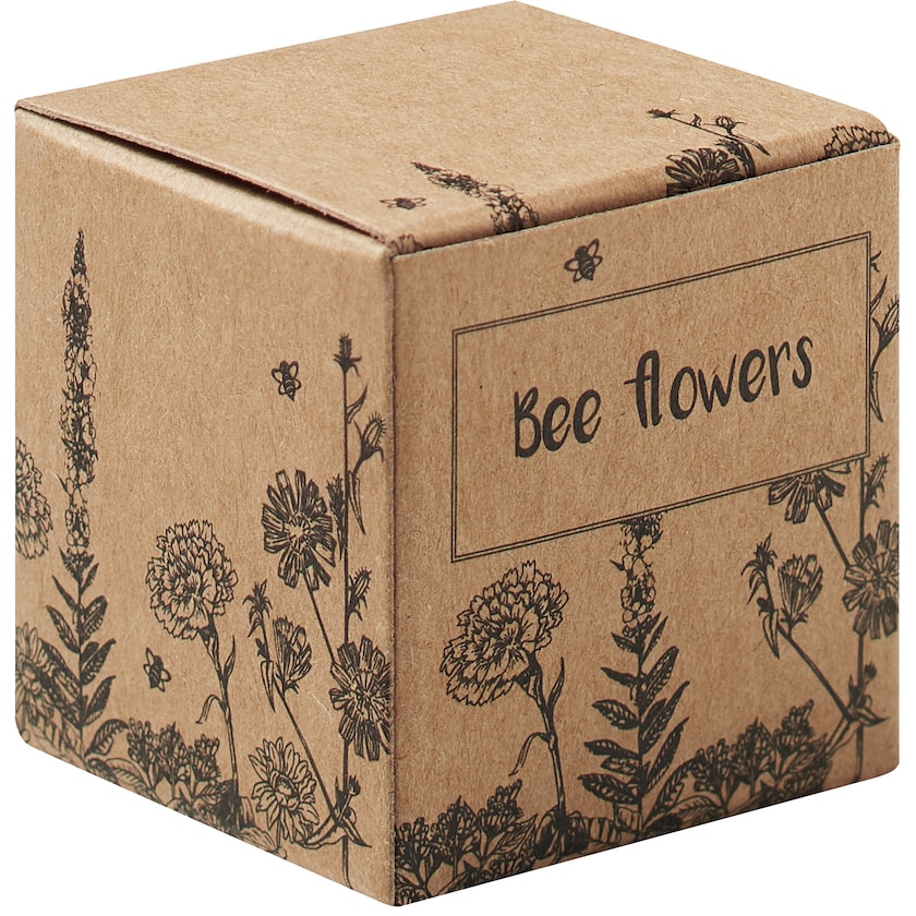 Set mit Pflanzball aus naturfarbenem Karton. Der Pflanzball enthält Samen für Blumen, die Bienen sehr mögen. Der Druck erfolgt auf der Oberseite des Kartons. Hergestellt in der EU.