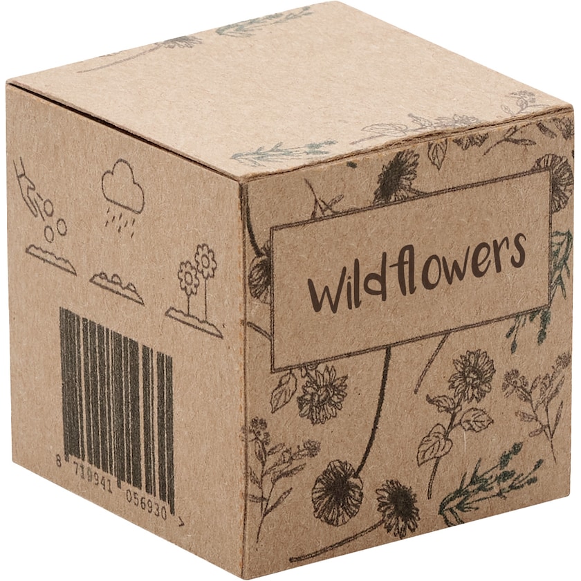 Pflanzenkugel mit Samen für Wildblumen. Geliefert in einem naturfarbenen Karton, auf dem Ihr Druck platziert wird. Hergestellt in der EU.