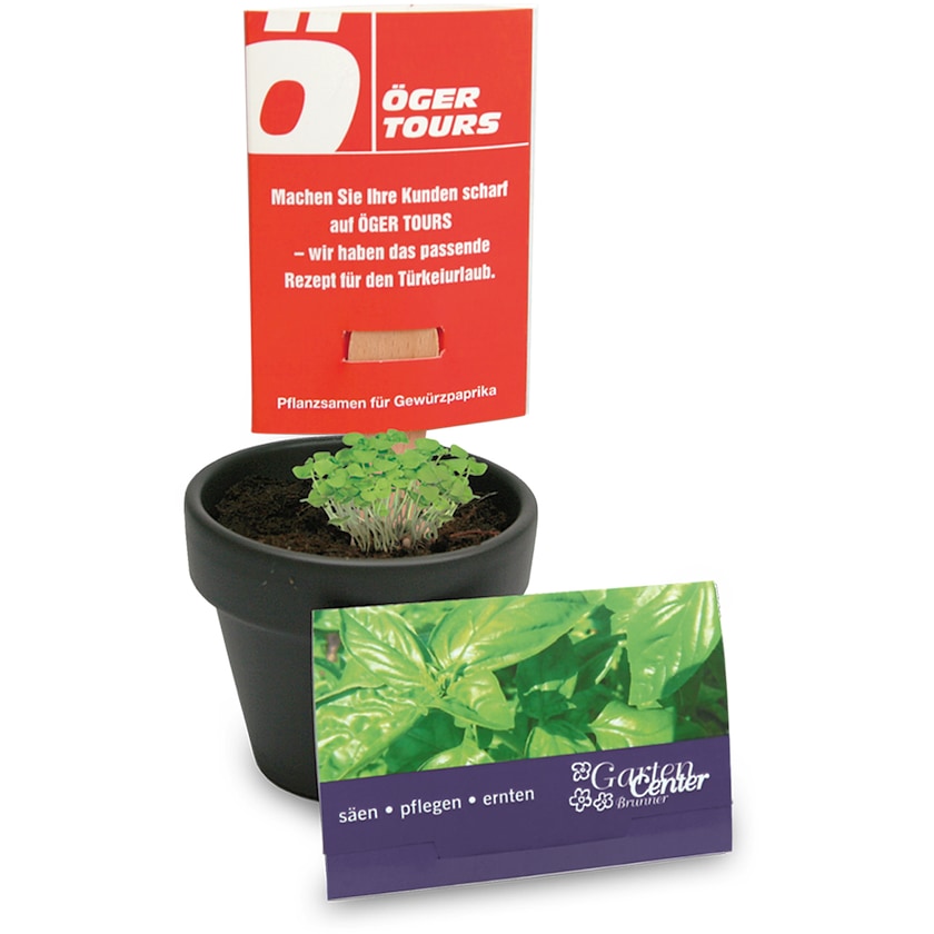 Holzstäbchen mit Samen, befestigt an einem Papierkärtchen mit Druck. Das Holzstäbchen wird von der Karte gelöst und in einen Topf mit Erde gesteckt. Danach lassen die Kräfte der Natur das Pflänzchen wachsen. Die Karte kann wieder am Stäbchen befestigt werden, sodass auch Ihre Botschaft weiter sprießt. Karte wird mit 4-Farbdruck versehen.