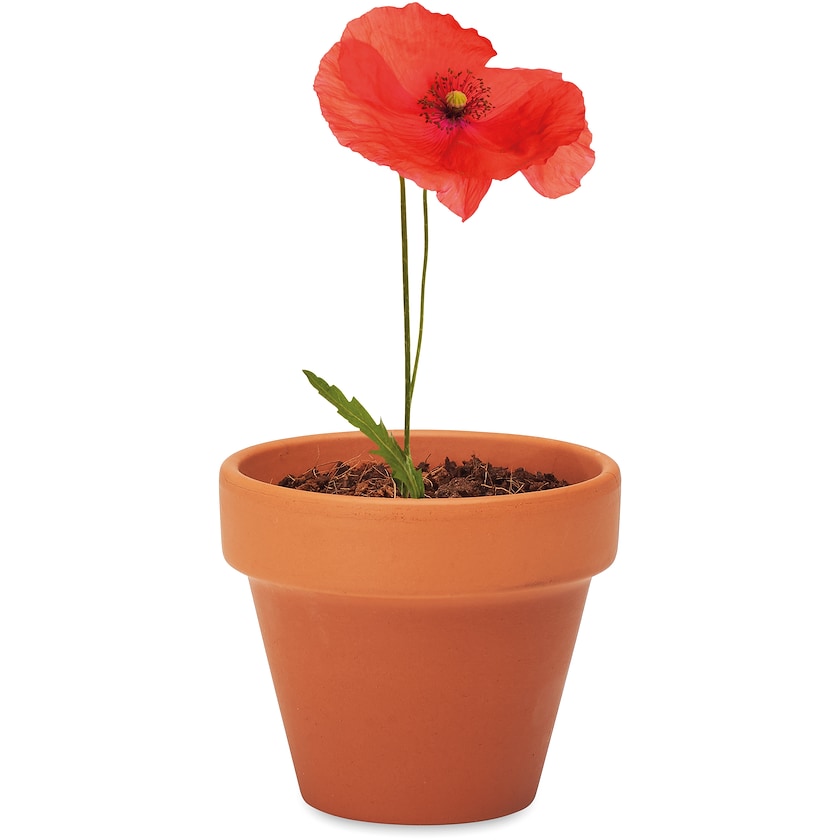 Kleiner Blumentopf mit Mohnsamen. Die Werbeanbringung kann entweder per Druck oder Lasergravur auf dem Blumentopf erfolgen oder per Druck auf der Oberseite der Kartonhülle. Nur einfarbiger Druck ist möglich. Hergestellt in der EU. Eine perfekte Wahl für alle die, die einen kleinen Blumentopf mit eigenem Druckmotiv suchen.