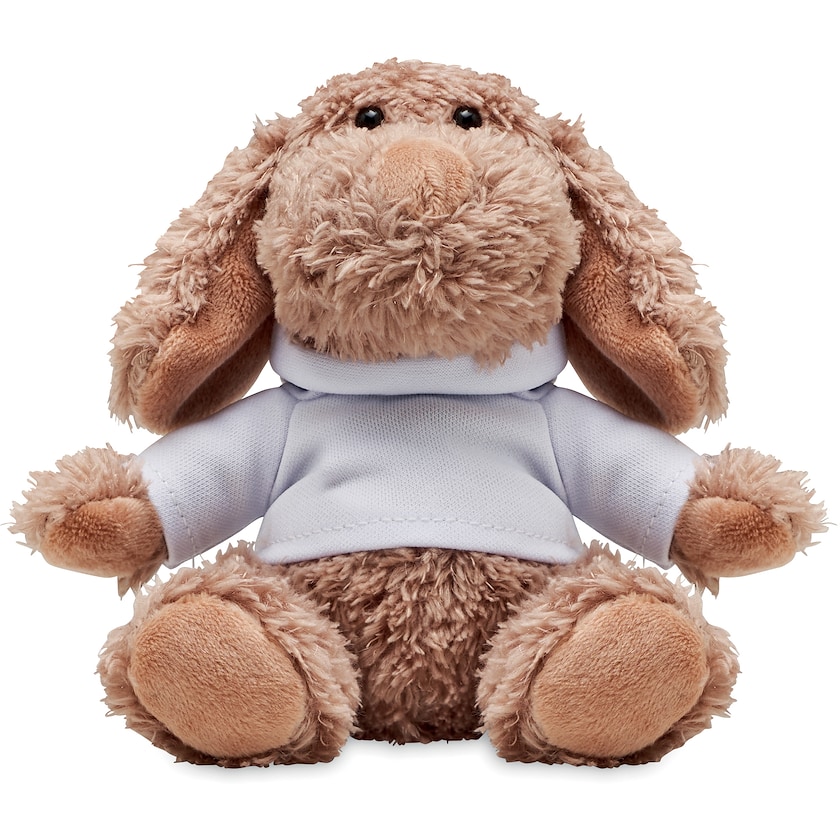 Kuscheltier in Form eines niedlichen Hundes. Der Hund hat einen weißen Hoodie, auf den gedruckt wird. Ein großer Favorit unter allen hundebegeisterten Kindern.
