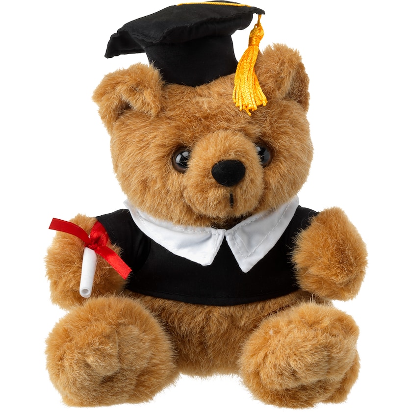 Teddybär im Examens-Look. In einer Hand hält der Teddybär ein Diplom. Es ist nur 1-farbiger Druck möglich.