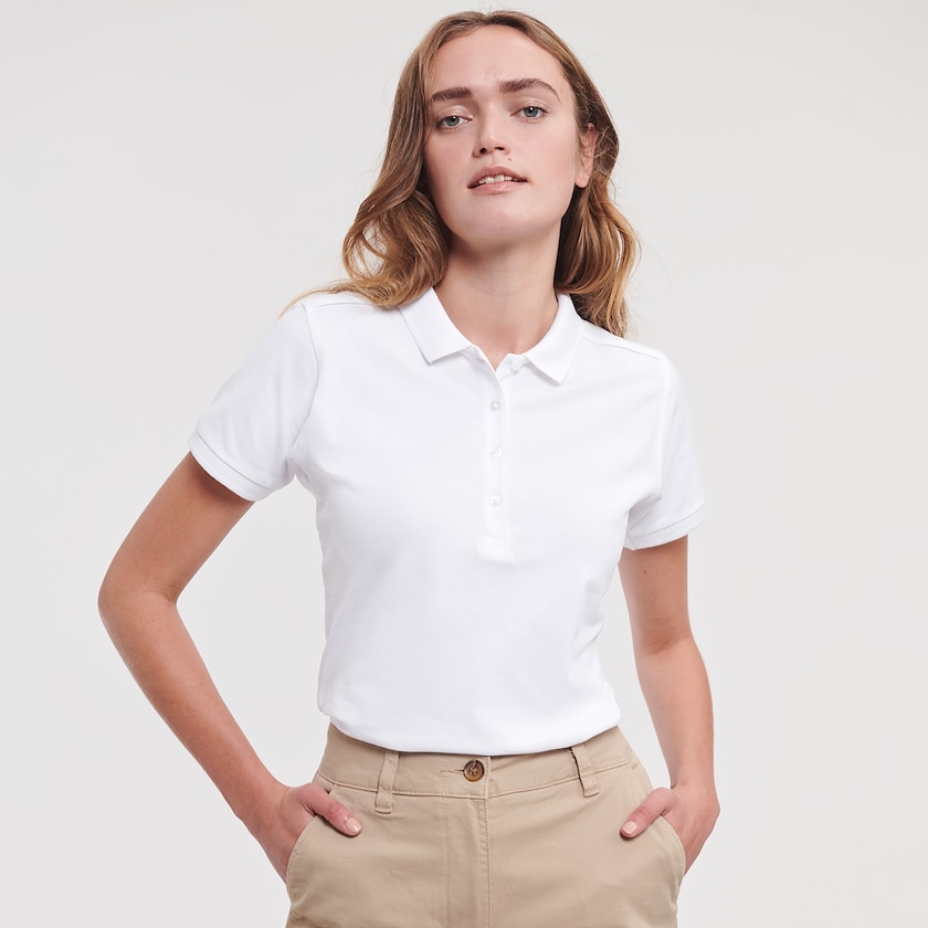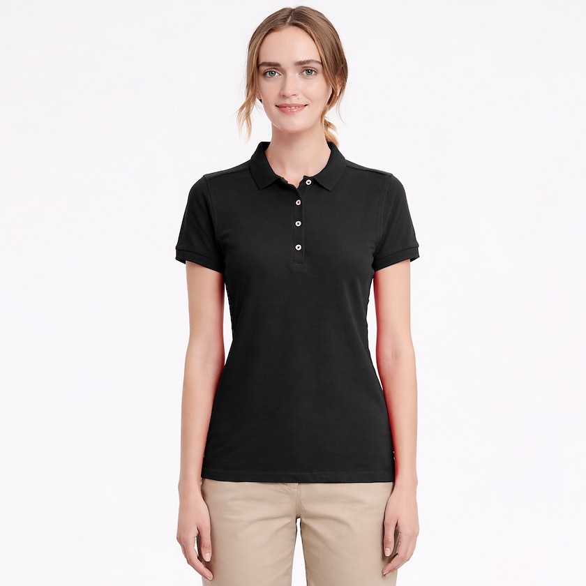 Tailliertes Polo-Shirt für Damen mit Stretch im Stoff. Der Stoff enthält 5 % Lycra, wodurch das Shirt angenehm anschmiegsam und bequem wird. Geliefert wird einzeln verpackt in Plastiktüten. Gibt es auch als Herrenmodell.