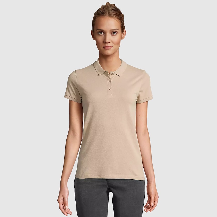 Damenpolo aus 170g/m² biologisch angebauter Baumwolle. Das Shirt hat drei Knöpfe, die der Farbe des Stoffes entsprechen. Der Baumwollstoff ist nach ÖKO-TEX zertifiziert. Gibt es auch als Herrenmodell.