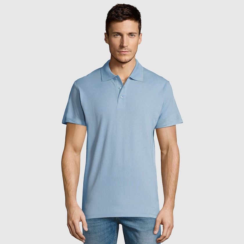 Herrenpolo mit Logo aus einem 170 g/m² Baumwollstoff. Das Poloshirt hat eine moderne Passform und drei Ton-in-Ton-Knöpfe am Halsausschnitt. Der Stoff ist ECO-TEX zertifiziert. Gibt es auch als Damenmodell.