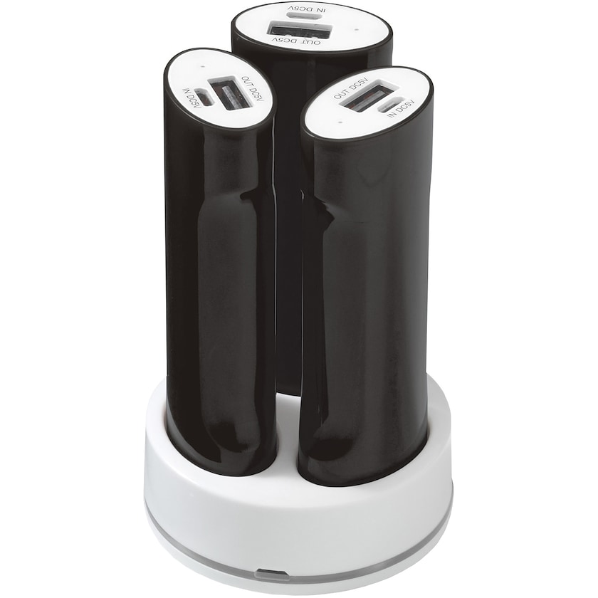 Set mit 3 Powerbanken, die an einer Dockingstation geladen werden. Laden Sie die ganze Familie gleichzeitig auf! Das Ladekabel ist im Lieferumfang. Jede Powerbank hat eine Kapazität von 2.200 mAh. Das Loge wird auf eine der Powerbanken aufgedruckt.