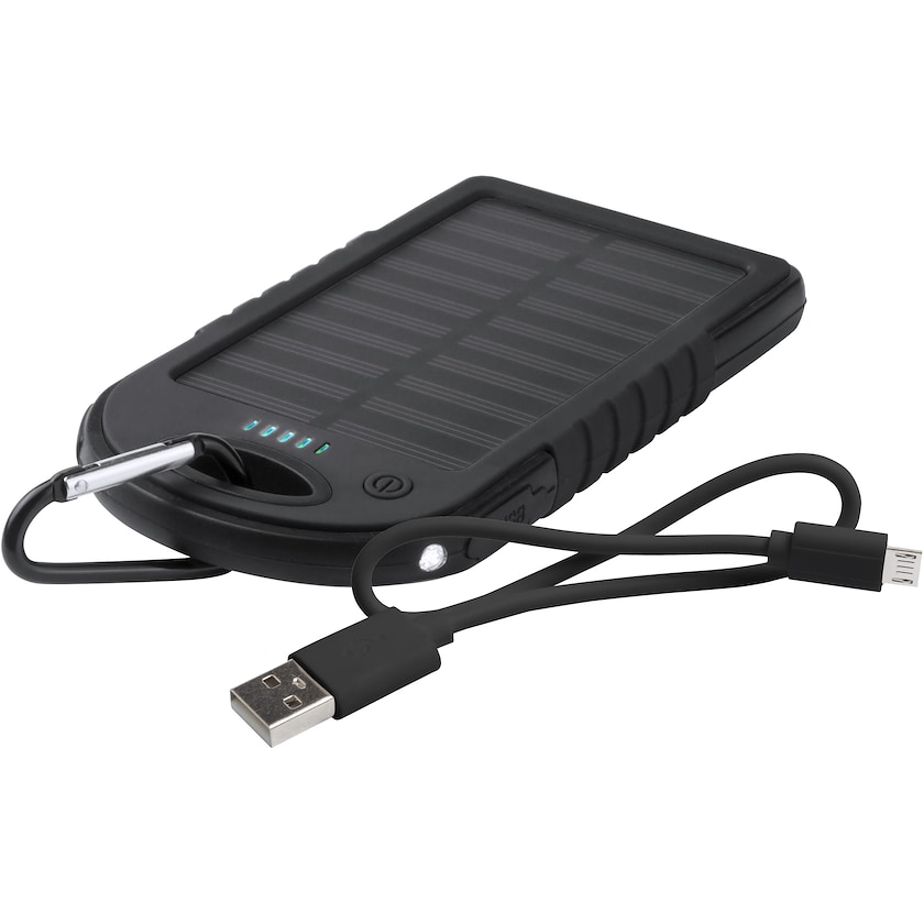 Solarbetriebene Powerbank mit LED-Lampe. Hector hat eine schützende Silikonhülle. Micro-USB-Kabel ist enthalten. Druck erfolgt in max. 2 Farben.