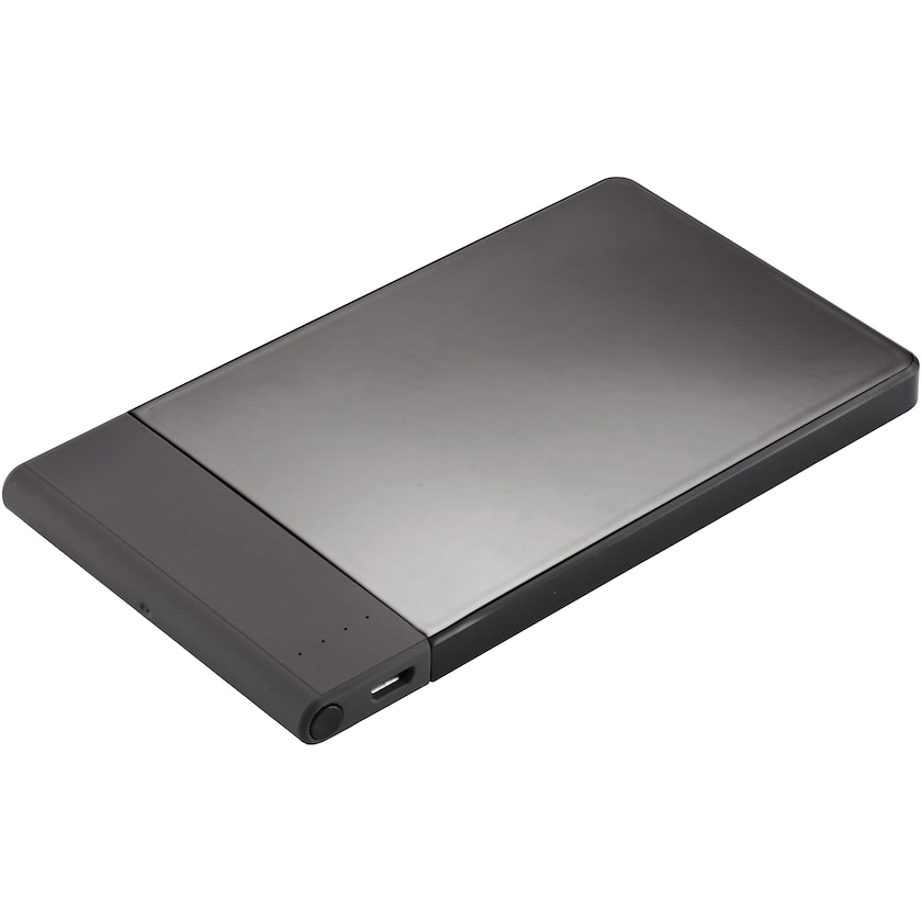 Superdünne, sehr kraftvolle Powerbank in Geschenkschachtel. Spectre hat output 5V/2.1A und input 5V/1A und hat einen Ausschaltknopf. Wird mit Micro-USB-Kable geliefert.