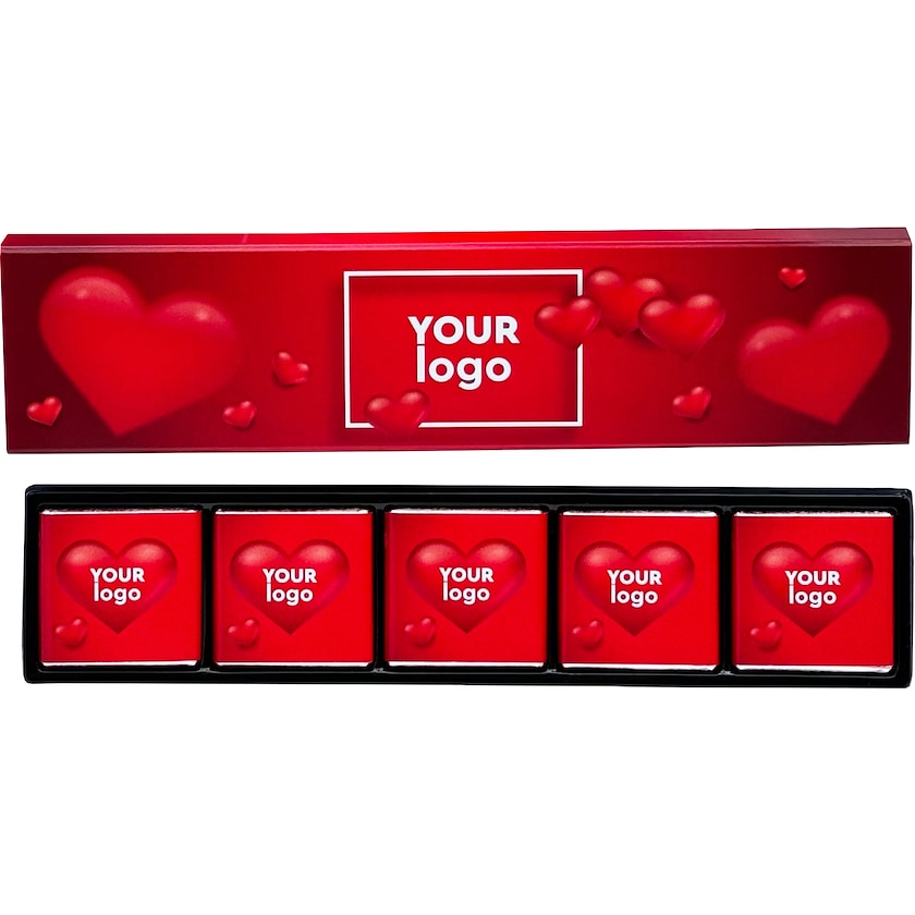 Pralinenschachtel mit 5 Schokoladenquadraten. Die Pralinenschachtel und die Schokoladenquadrate werden nach Ihren Wünschen bedruckt. Wählen Sie zwischen Milchschokolade oder dunkler Schokolade.