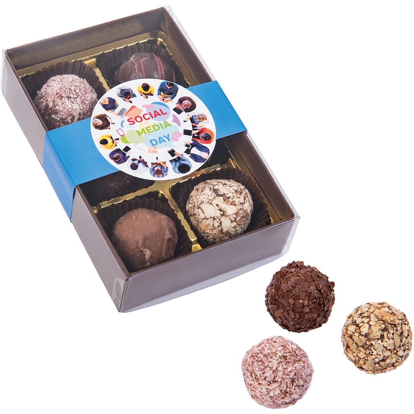 6 Schokoladenpralinen in einer Pralinenschachtel mit transparentem Deckel. Die Schokoladenpralinen werden auf Bestellung hergestellt und sind in verschiedenen Geschmacksrichtungen erhältlich. Die Pralinenschachtel ist mit einem Band versehen, das nach Ihren Wünschen bedruckt wird.
