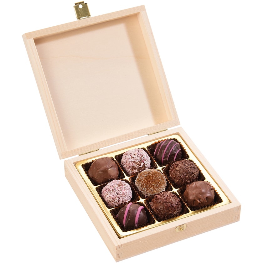 9 Schokoladenpralinen aus belgischer Schokolade in einer schönen Holzschachtel. Die Schokoladenpralinen werden auf Bestellung hergestellt und sind daher immer völlig frisch. Erhältlich in gemischten Geschmacksrichtungen. Der Deckel der Holzkiste wird nach Ihren Wünschen bedruckt.
