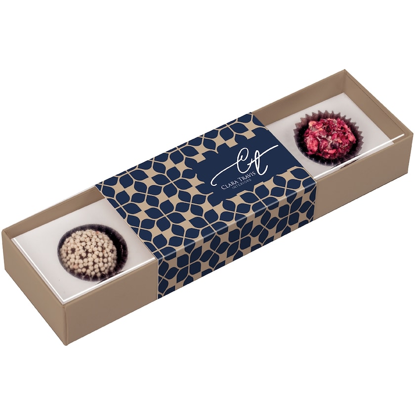 Pralinenschachtel mit 4 fantastischen Schokoladentrüffeln. Die Schokoladentrüffel gibt es in gemischten Geschmacksrichtungen. Der Druck befindet sich auf einem Banner, das um die Pralinenschachtel herum platziert wird. Sie bestimmen auch den Druck auf den Karton und seiner Innenseite.