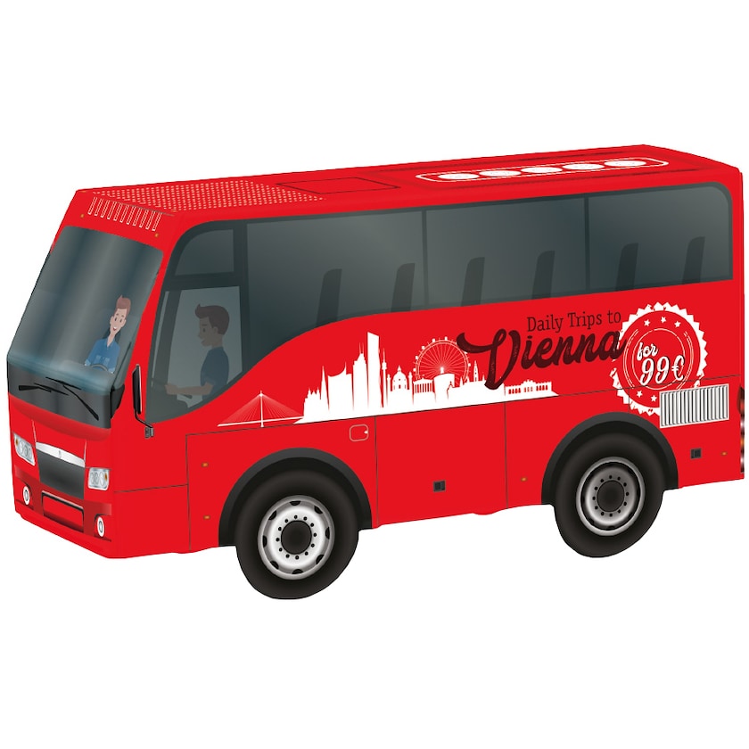 Bus gefüllt mit Bonbons oder Schokolade. Der Bus wird aus FSC-zertifiziertem Papier hergestellt und ganz nach Ihren Wünschen bedruckt. Wählen Sie frei zwischen folgenden Füllungen: Mentos Kaubonbon (36,5 Gramm, 12 Monate haltbar), Ritter Sport (60 g, 6 Monate haltbar) oder Lindt Lindor Milchkugeln (50 Gramm, 6 Monate haltbar).