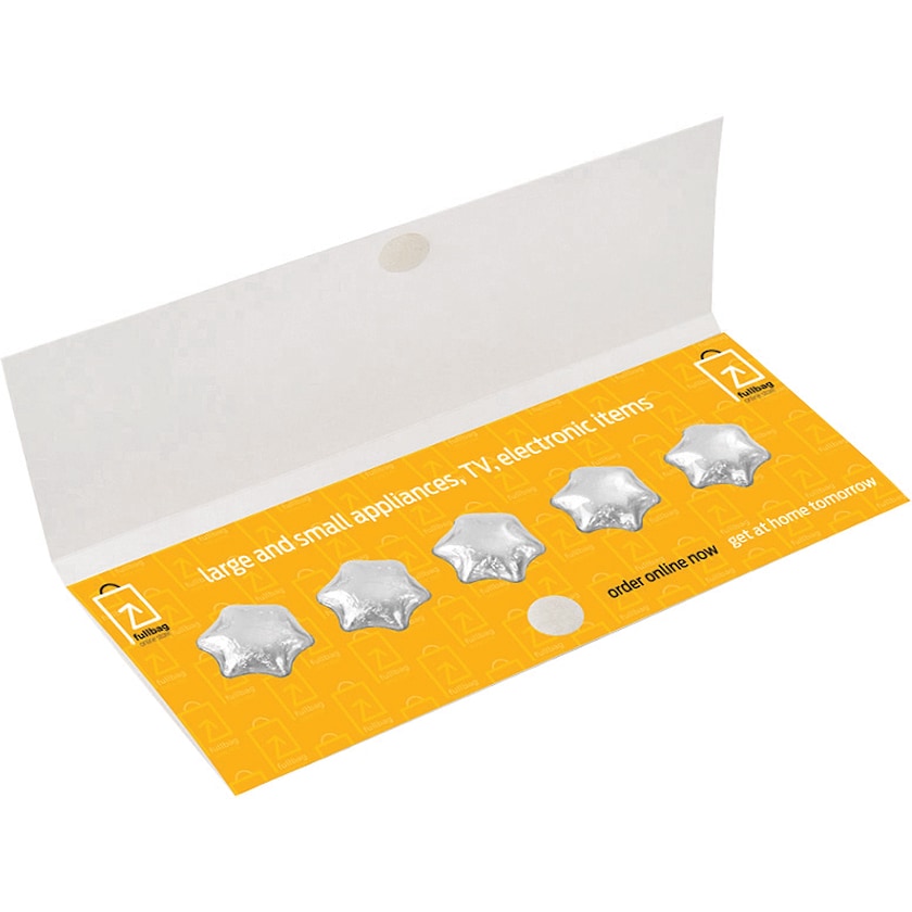 Schokladenschachtel mit fünf Schokoladensternen aus hochwertiger Milchschokolade. Die ganze Verpackung wird nach Ihren Wünschen bedruckt und Sie können zwischen roter, silberfarbener oder goldfarbener Folie wählen.