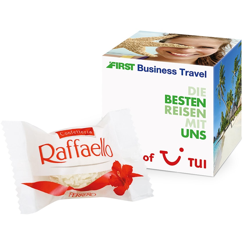 Kleine Pappschachtel mit 1 Ferrero Raffaello. Raffaello ist die einzigartige und exklusive Kombination aus leichter Waffel, cremiger Füllung, einer gerösteten Mandel und weißem Kokos. Die ganze Verpackung wird nach Ihren Wünschen bedruckt.