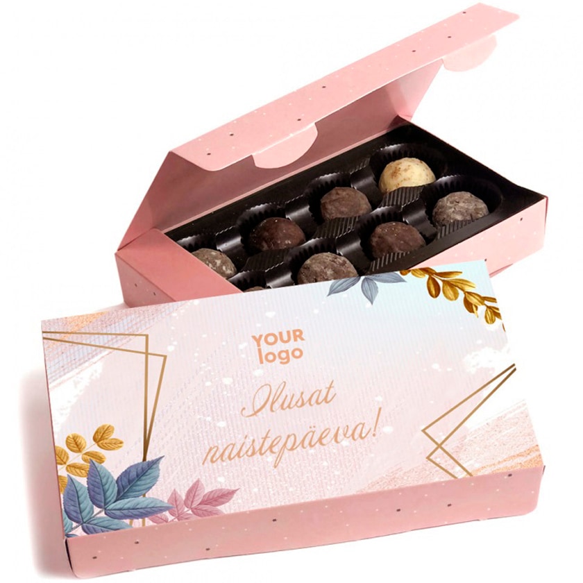 Schokoladenschachtel mit acht Schokoladenpralinen. Die Schokoladenpralinen kommen in gemischten Geschmackssorten. Die gesamte Pralinenschachtel wird nach Ihren Wünschen bedruckt. Ein hochwertiges Geschenk für wichtige Kunden und Mitarbeiter.