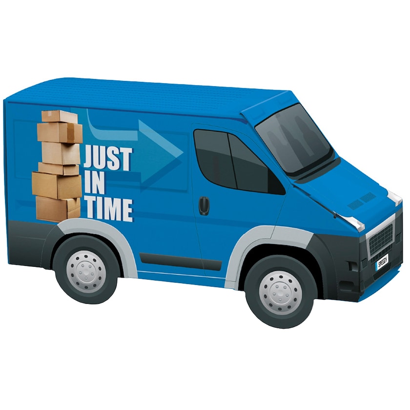 Transporter mit eigenem Aufdruck, der mit Bonbons oder Schokolade gefüllt ist. Der Transporter besteht aus FSC-zertifiziertem Papier und wird ganz nach Ihren Wünschen bedruckt. Sie können zwischen folgenden Inhalten wählen: Mentos Kaubonbon (36,5 Gramm, 12 Monate haltbar), Ritter Sport (60 g, 6 Monate haltbar) oder Lindt Lindor Milchkugeln (50 Gramm, 6 Monate haltbar).
