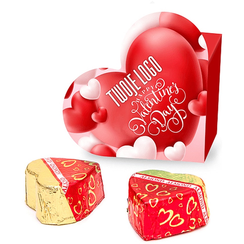 Herzförmige Schokoladenschachtel mit zwei herzförmigen Schokoladenstücken. Die Schokoladenstücke gibt es mit verschiedenen Füllungen (alle bestellten Schokoladenschachteln enthalten den gleichen Geschmack). Laden Sie die Druckvorlage runter und erschaffen sie eine Schokoladenschachtel voller Liebe.