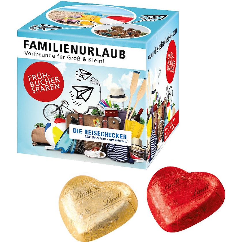 Kleine Geschenkbox mit eigenem Logo mit 5 Schokoherzen von Lindt. Alle Seiten der Schachtel sind im 4-Farb-Fotodruck bedruckt. Eine kleine Schokoladenschachtel gefüllt mit Liebe und leckerer Milchschokolade.