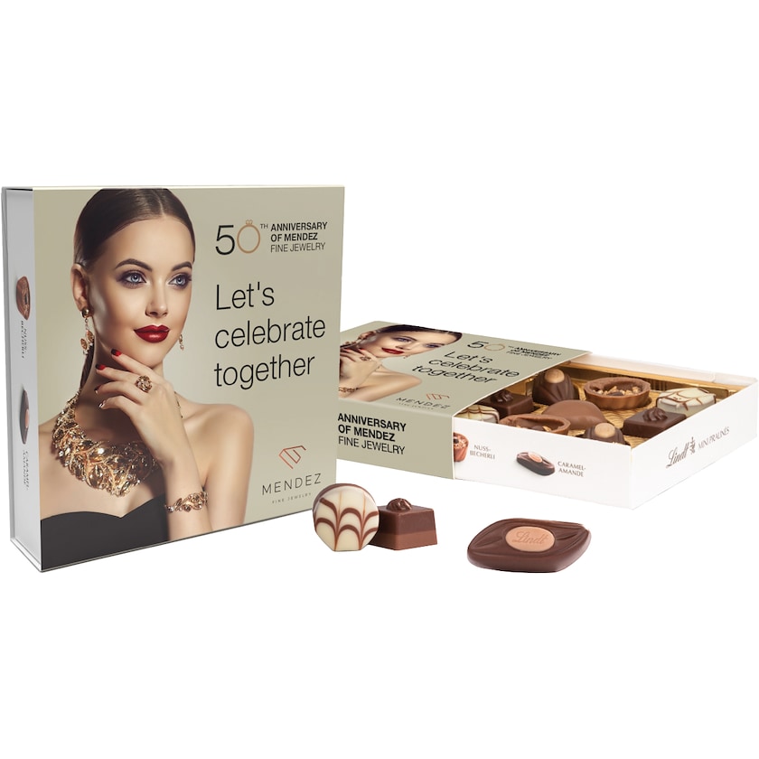 Neun exklusive Pralinen des Schokoladenherstellers Lindt in einem Geschenkkarton. Der Karton hat einen transparenten Deckel mit einer Einlage, die nach Ihren Wünschen bedruckt wird.